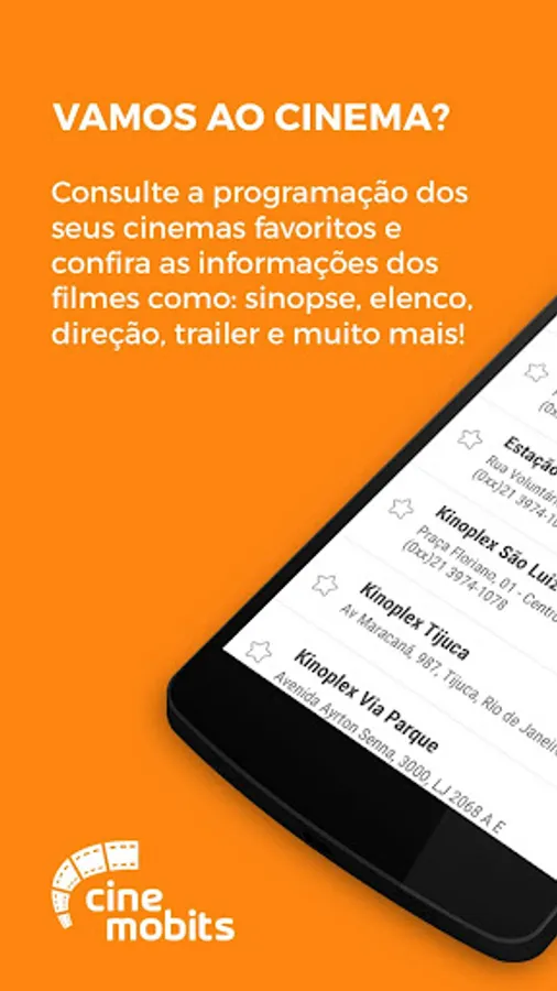 With Cine Mobits, you can check the programming in your favorite movie theaters and have quick access to movie information like: synopsis, cast, direction, trailer and more!