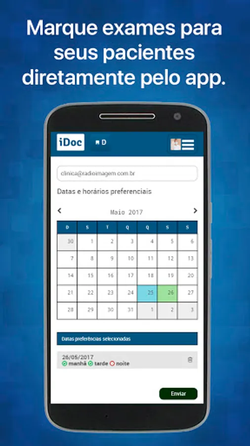 Ask your radiologist to publish your patients' exams on iDoc. With this, he is already registered in your virtual office and you can now access the exams. You can also include new patients, photos, exams, clinical data and more.