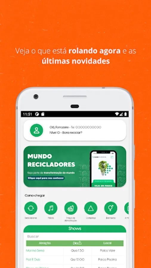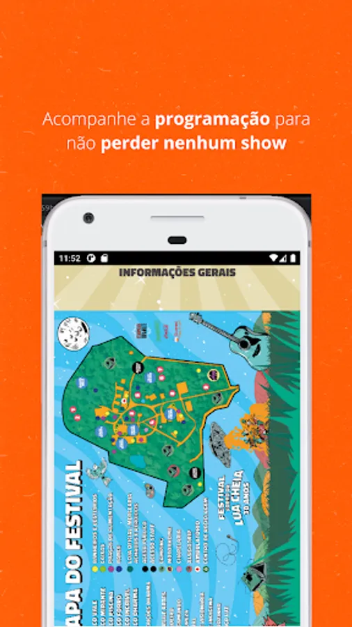 With this app, you'll be able to have up-to-date information about the event, such as the schedule of shows and also a digital guide, which is an interactive map with the main points of the festival. In addition, you will be able to follow your evolution during the 4 days of the event, checking your score and how much you have recycled.