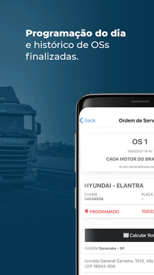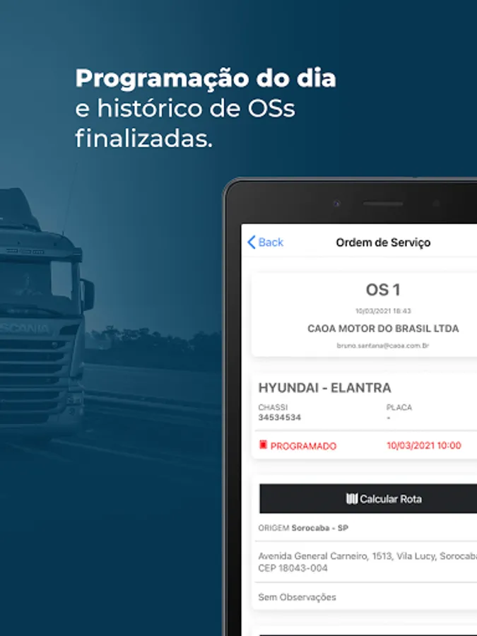 Aplicativo possui módulo web onde a empresa poderá cadastrar clientes, veículos, motoristas, ordem de serviços, configurar checklists e ter controle financeiro dos serviços prestados. Quando uma ordem de serviço é programada o motorista selecionado recebe uma notificação no app informando sobre tarefa.