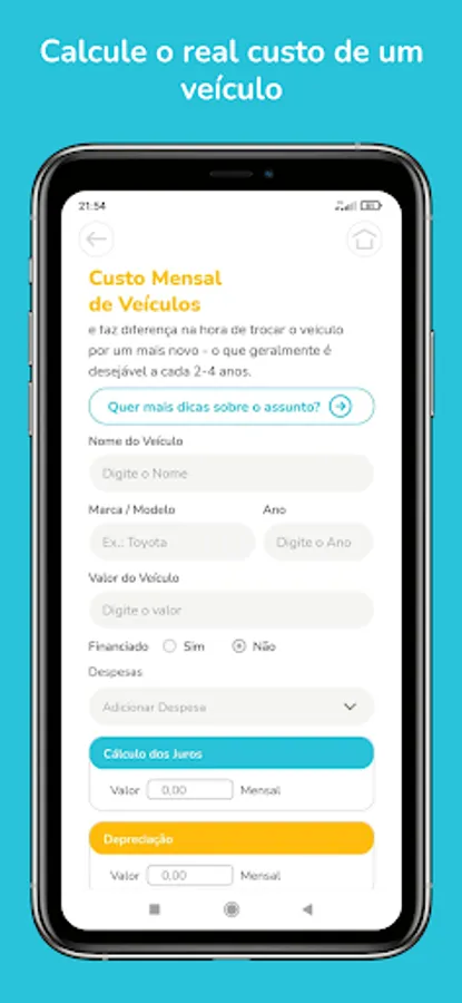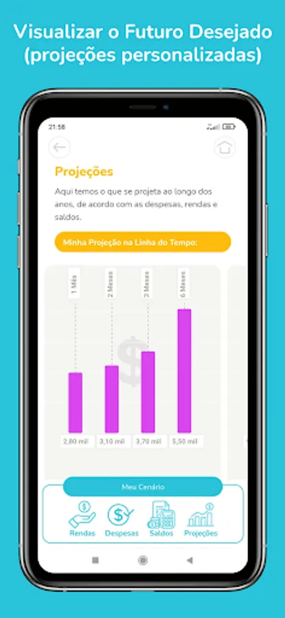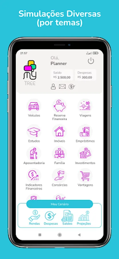 View projections of your financial life in up to 25 years. MyTree came to help you organize your financial life, making it easier to control expenses according to your earnings and the capital already accumulated. In addition, make simulations of the objectives you want to achieve, and the different types of banking products; financing, consortia, etc.