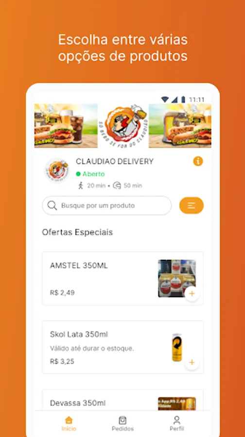 The Claudião Delivery app has arrived, Choose from several product options. Chose, Asked, Arrived!