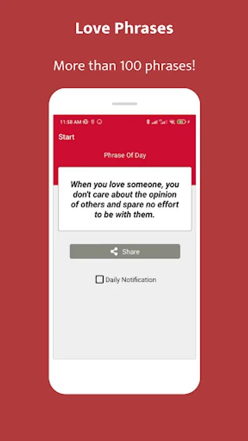 Easy sharing: With just a few taps, you can share the phrases directly to your favorite social networks like Facebook, Instagram, Twitter and more. Show the world the power of love by spreading positive and inspiring messages.