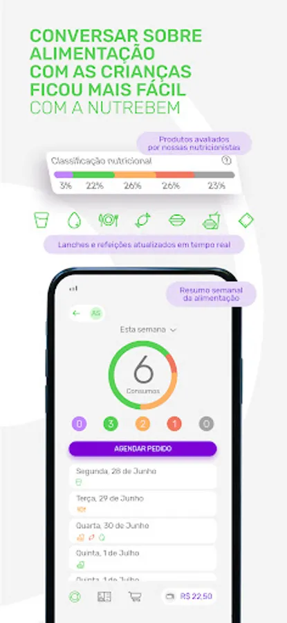Nutrebem is a digital account that nutritionally assesses snacks consumed in the school canteen. Discover our main features: