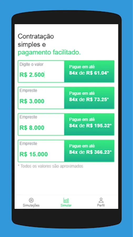 Simulate now. Fast and Secure Payroll Loan It's in the palm of your hand. Simulate Now by Mobile. No Credit Consultation. Online Simulation. Special Fees and Deadlines.