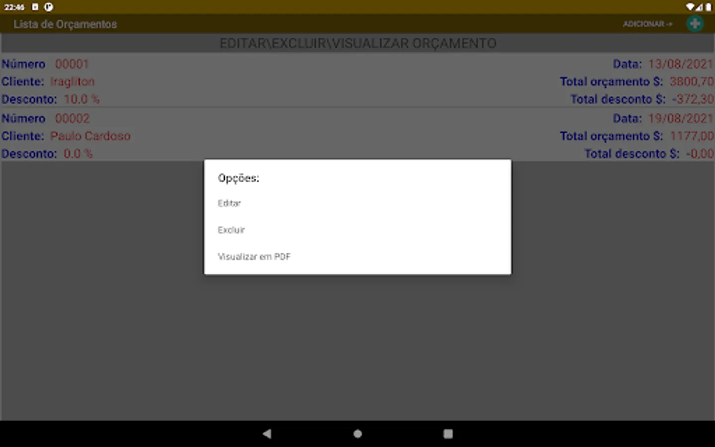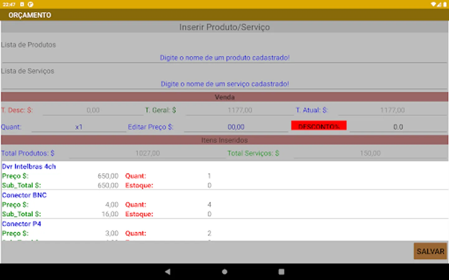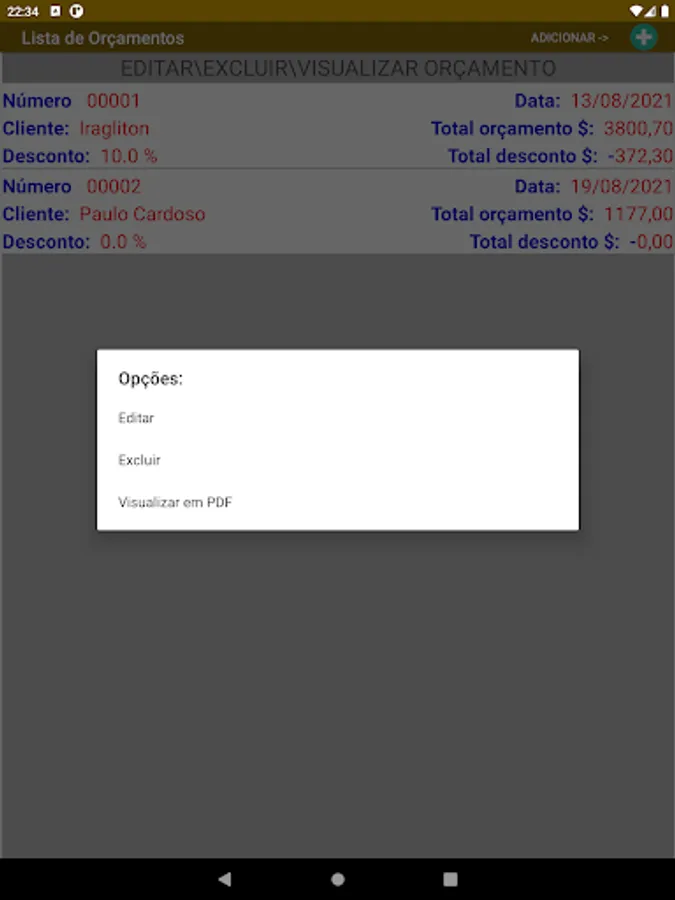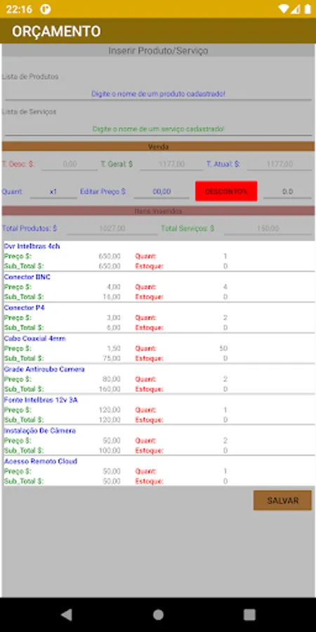 Application to generate budget and sales, simple control of stock, registration of customers, products, suppliers and service in addition to the data of your company or autonomous. makes it possible to send a quote to the client by sharing. It has a discount system only for the product, editing the product's value when eneserir.