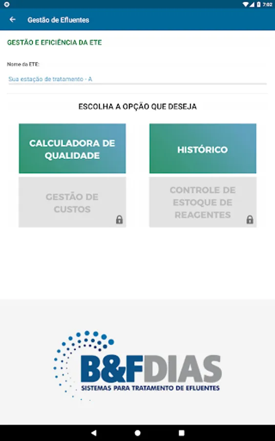 By sending data on system parameters, compliance or nonconformity information of the treated effluent values based on the literature is provided, as well as the efficiency that is being achieved by the ETE. It is also allowed access to the history of the efficiency reports generated and the realization of their sharing via whatsapp.