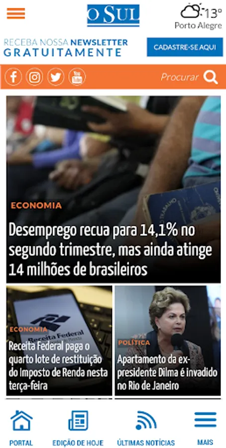 With a strong presence on social networks, Jornal O Sul brings updates to its followers at all times, reflecting the events highlighted on Facebook, Instagram, Youtube and Twitter, and also making available to the market, in a pioneering and innovative way, your daily Newsletter, which can be received by the reader via WhatsApp or by e-mail, without any cost, just by registering in 30 seconds through the O Sul app or by accessing the Osul.com.br portal.