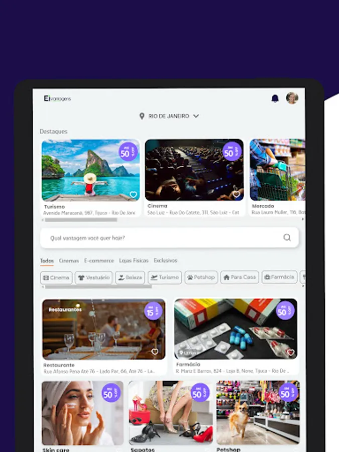 - Advantages Club: Many discount options in physical establishments and ecommerces. Discounts are instant and use is daily and unlimited.