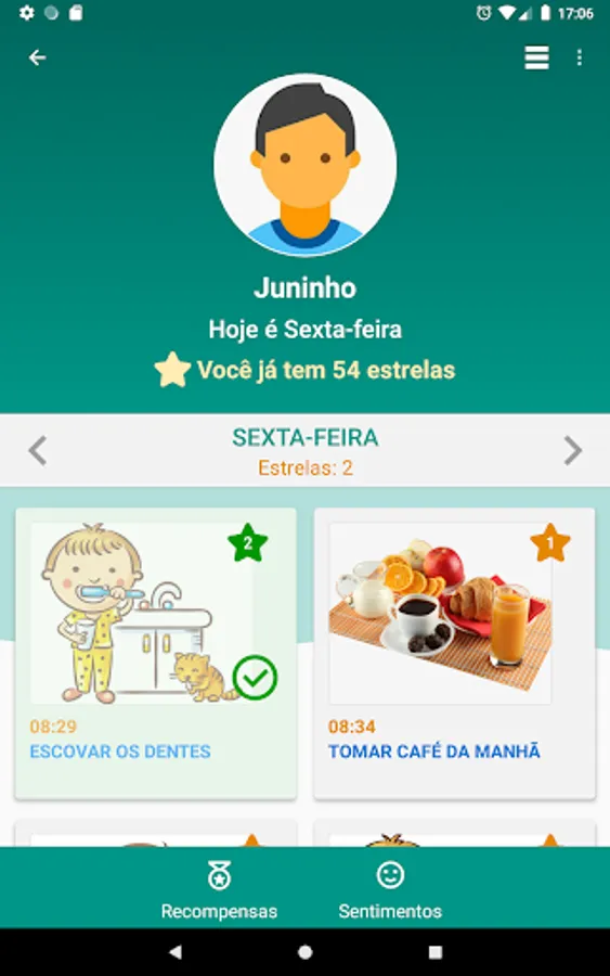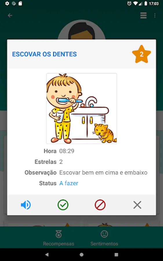 Registration of daily chores at their due times with the option to mark them as completed. The system provides some chores previously registered, but it is possible to register your own chores and include the desired image.