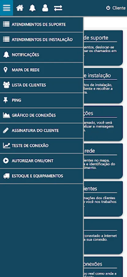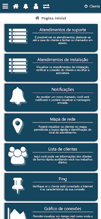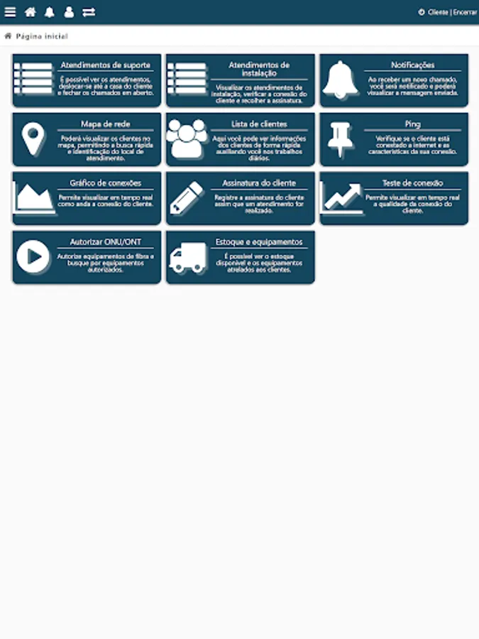 With the client area application you will be able to issue your slips and receipts, receive notifications and warnings, open calls and referrals, test your connection speed and much more.