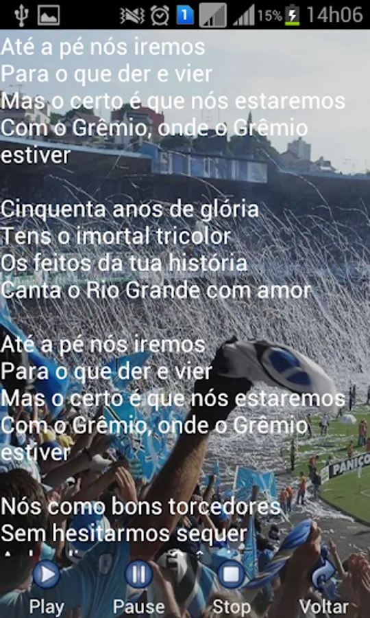 * Tricolor Gaúcho - Twisted Music is not the official application of Grêmio, it is a fan-made application. All news content is presented according to public content (made available by Google News). The Tricolor Gaúcho - Songs of the Torcida does not have, in any way, connection with any team or news site. If you have seen any inappropriate content, please contact planetaappsmusicas@gmail.com.