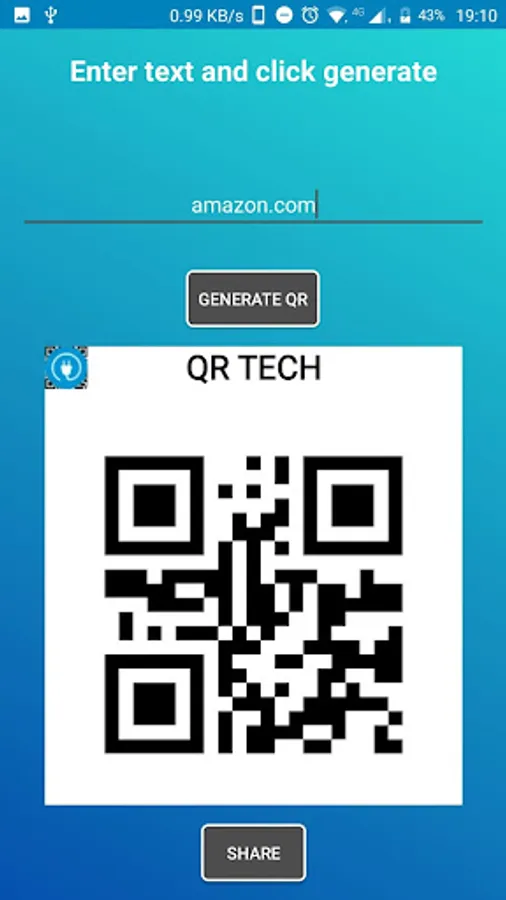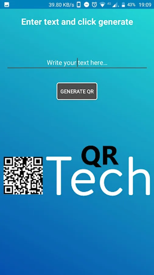 To create a QR code, just click the Create button, a screen will open with a field to enter the text, after typing and clicking the Generate QR button, the generated code will be shown below along with the share option by clicking on share, sharing options will be displayed, varying from device to device.