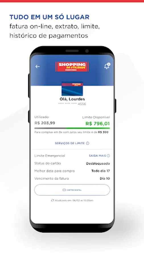 With the Utilidade Shopping Card application, you can make purchases, check your limits, see your transaction history, control your expenses, remember where they happened, and stay on top of promotions. All this in a practical and fast way.