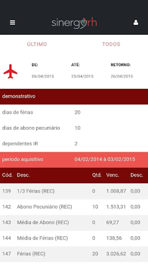 Vacation Receipt: Consultation of all values of the vacation receipt by purchasing period.