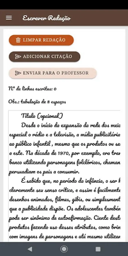 Write your text in the app itself, observing the title and paragraph indications. For the indentation of each paragraph start, give 10 spaces. And the title, depending on the contest, can be optional. After your text is ready, send it to the app for correction. Then, you pay a fee of $ 5.00 for the correction. This value is for each essay sent for correction.