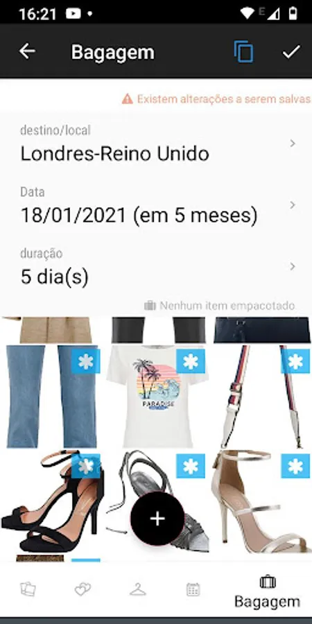 LUGGAGE: check lists with various items and looks assembled for each day of your trip;