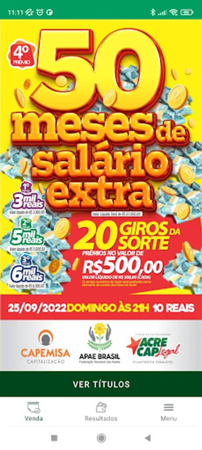 The application allows the sale of Acre Cap contribution titles and the search for the results of the draws.