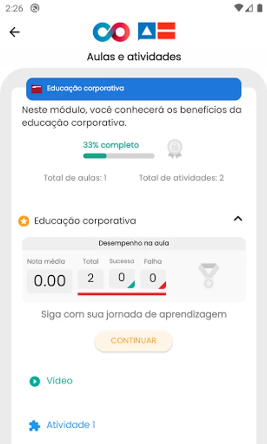 Dashboard area for monitoring notes and modules and listing courses. Possibility of viewing short videos and issuing certificates of completion.