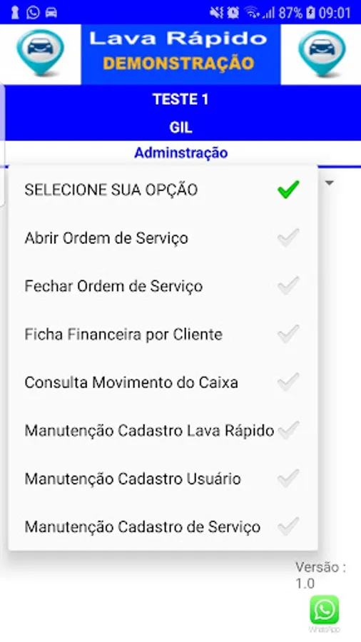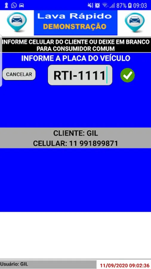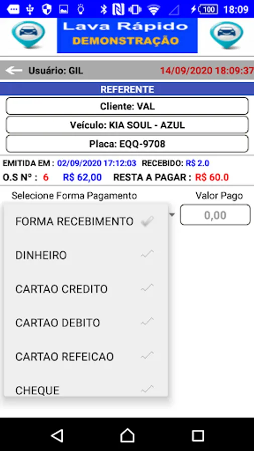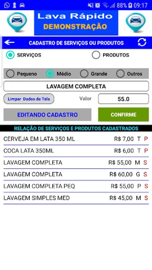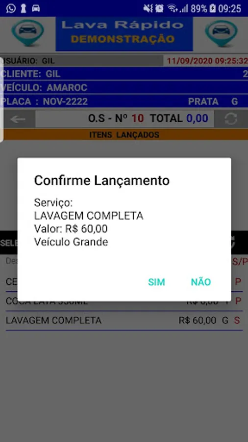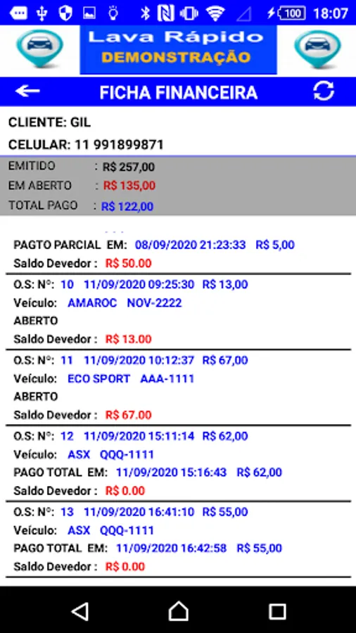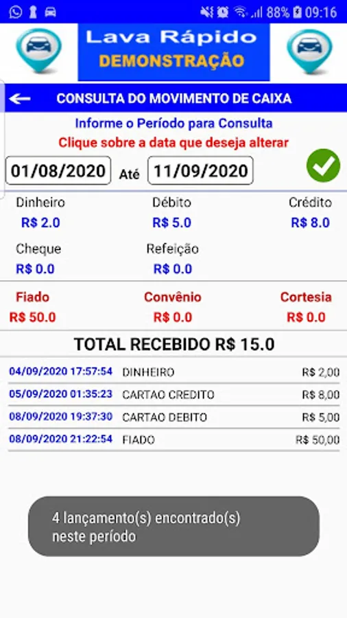 Application for control and management of car wash, controls the entry and exit of vehicles for washing, with control of Cars and Clients, control with financial file per customer with data of paid and Open service orders - control of daily movement per period with total amounts in: Cash, Credit Card, Debit Card, Meal Card, Checks, Receipts Control in Payments / Agreements and Washes with Amenities.