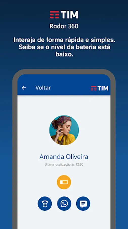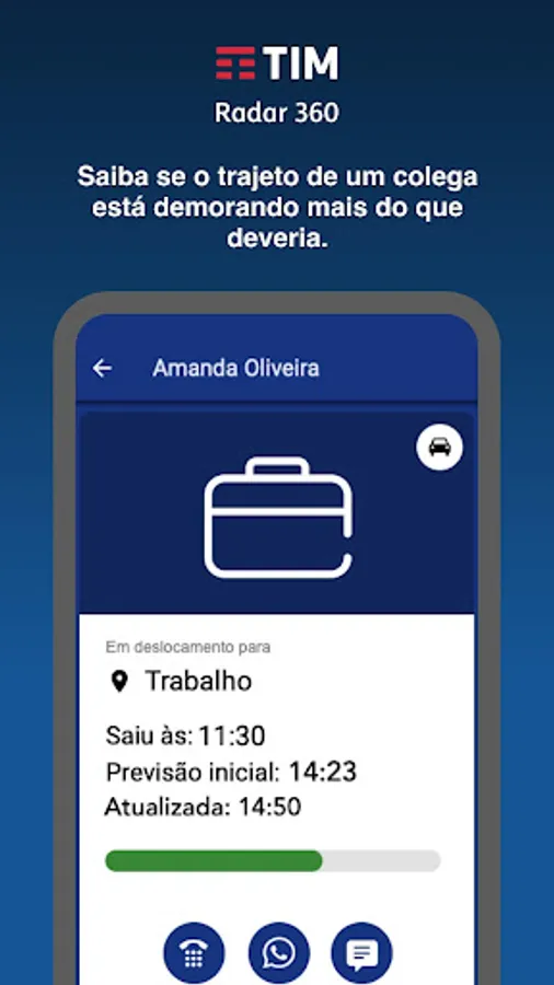 Just open the APP and the map will open, showing where your colleagues are, at any time. By clicking on the contact image, you will see the time of your last location, the battery level of his cell phone and also you can interact with him through Whatsapp, SMS or connection.