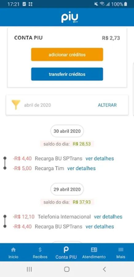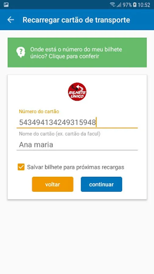 • Reload the transport card (Bilhete Único São Paulo, URBS Curitiba and Metrocard Grande Curitiba);