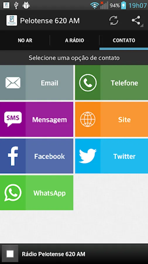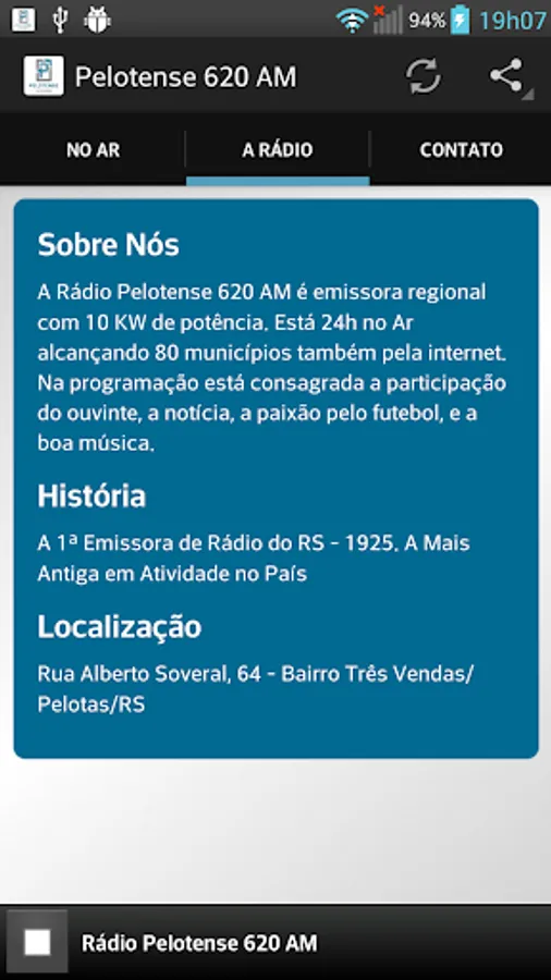 Radio 620 AM Pelotense is regional station with 10 kW of power. Is 24 Raised reaching 80 municipalities through the Internet.