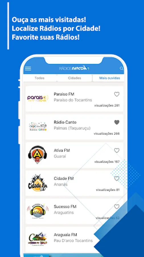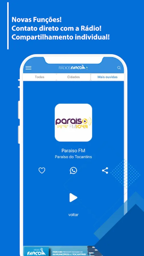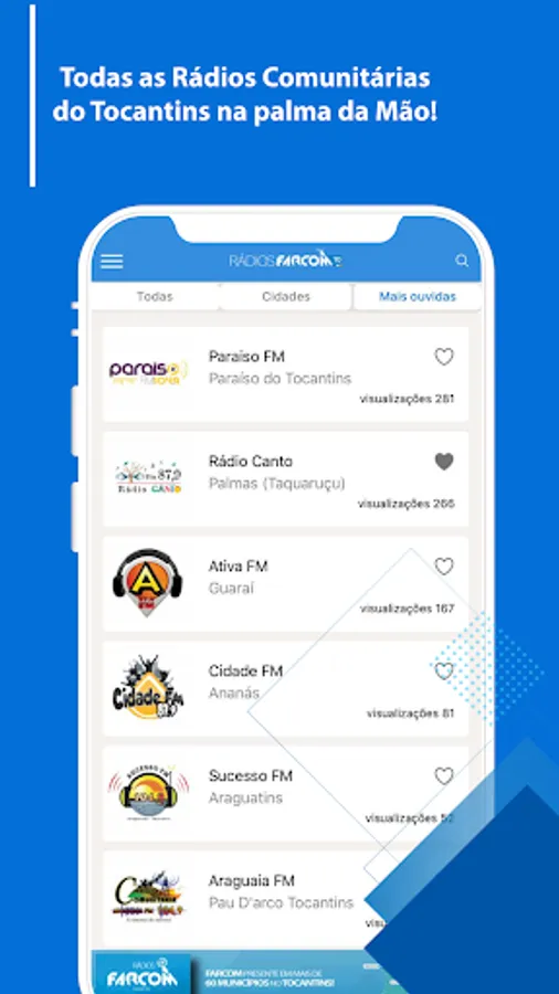 Now you can listen to all community radios in Tocantins here on the Farcom Tocantins Radios App, favorite your radios and hear in good quality what happens in your city!