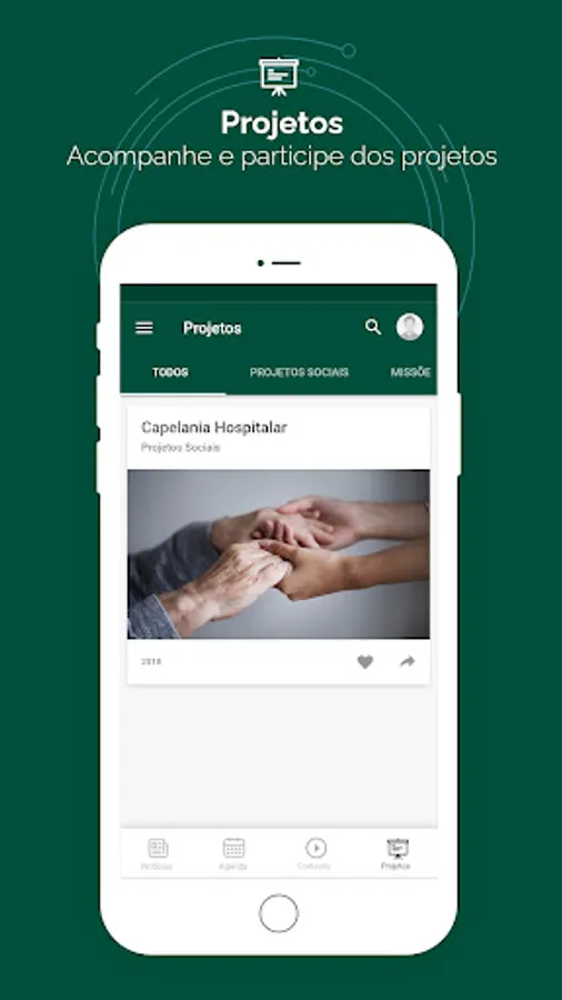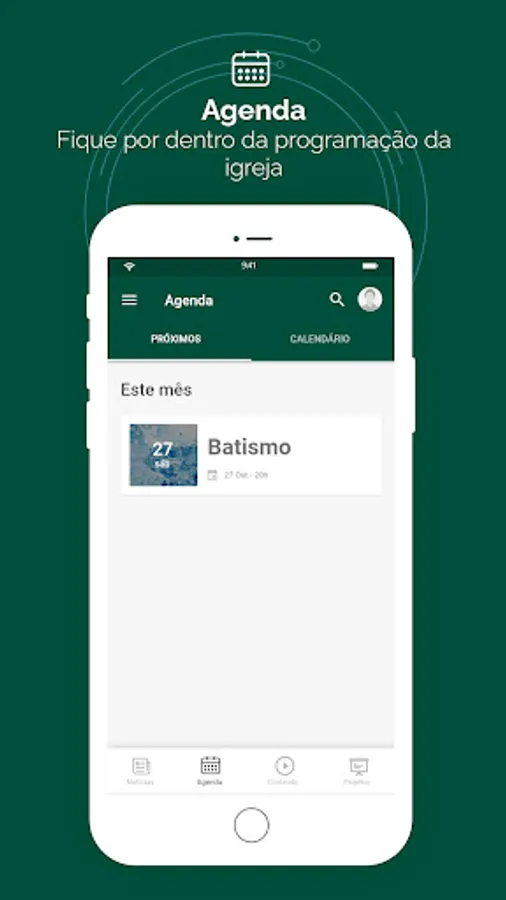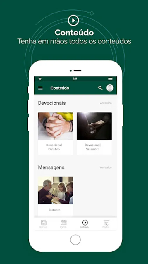 Resources available in the Application: News, Church Agenda, Events, Content, Projects, Live Broadcast and Teaching Module.”