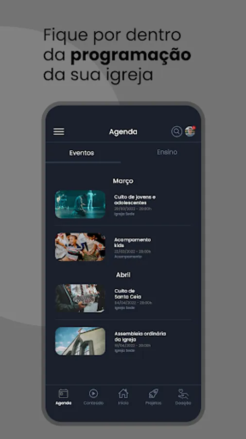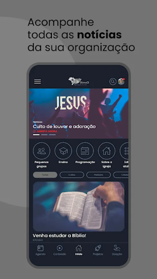 Resources available on the App: News, Church Agenda, Events, Content, Projects, Live Stream and Teaching Module
