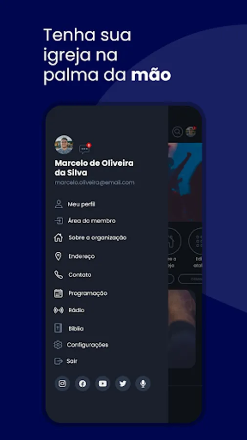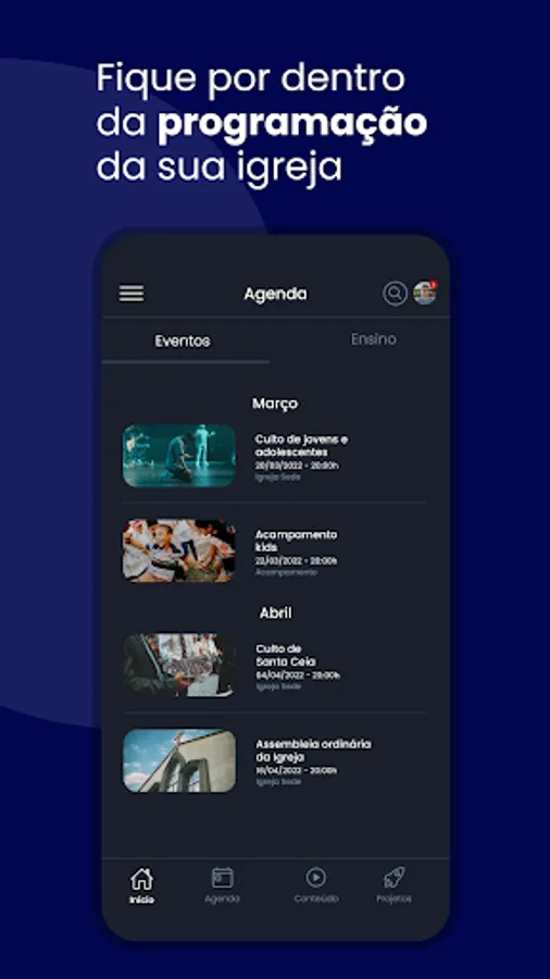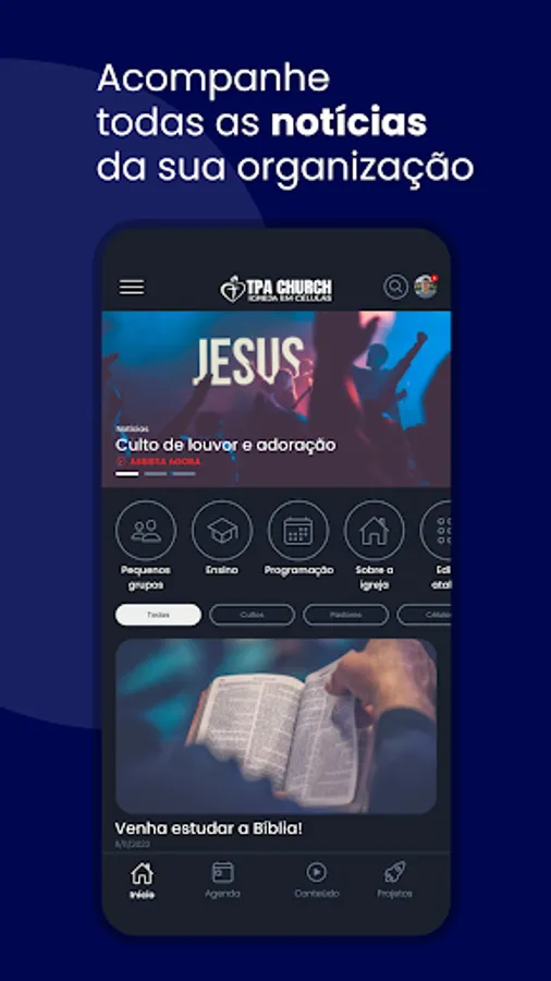 Resources available in the Application: News, Church Agenda, Events, Contents, Projects, Live Transmission and Teaching Module