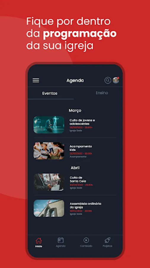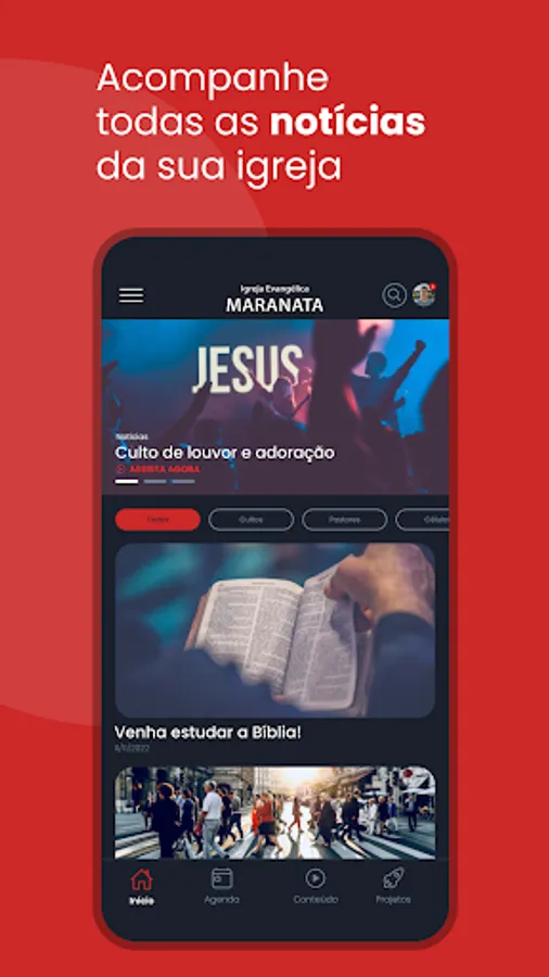 Resources available in the Application: News, Church Agenda, Events, Contents, Projects, Live Transmission and Teaching Module.