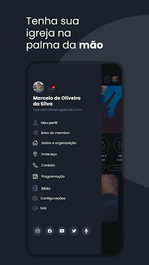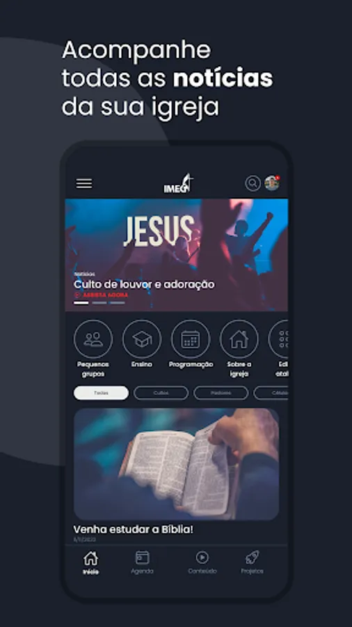 Resources available in the Application: News, Church Agenda, Events, Contents, Projects, Live Transmission and Teaching Module.