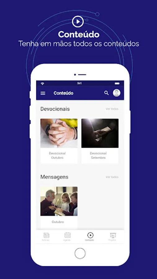 In our application, the disciple will be able to find: agenda, studies for the cell (written), photo gallery, videos, cult broadcasts, prayer requests, news, projects, Donations.