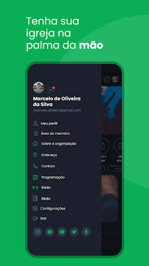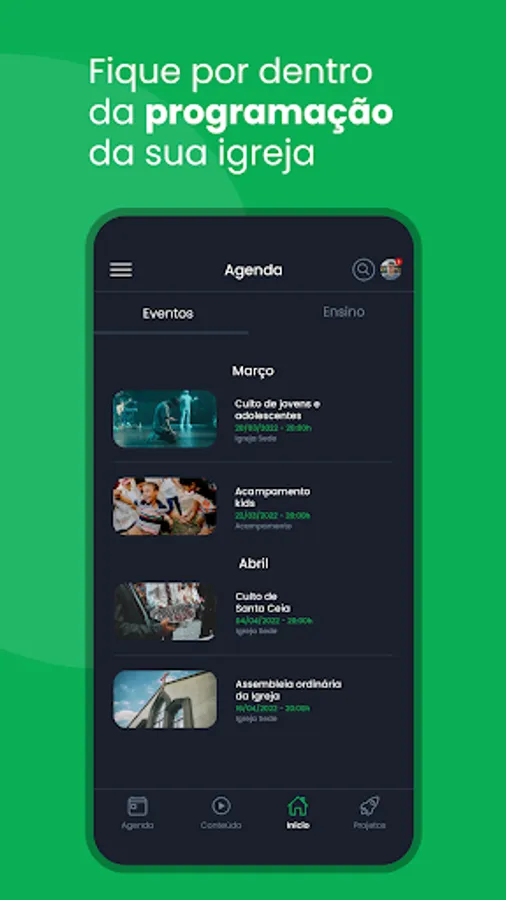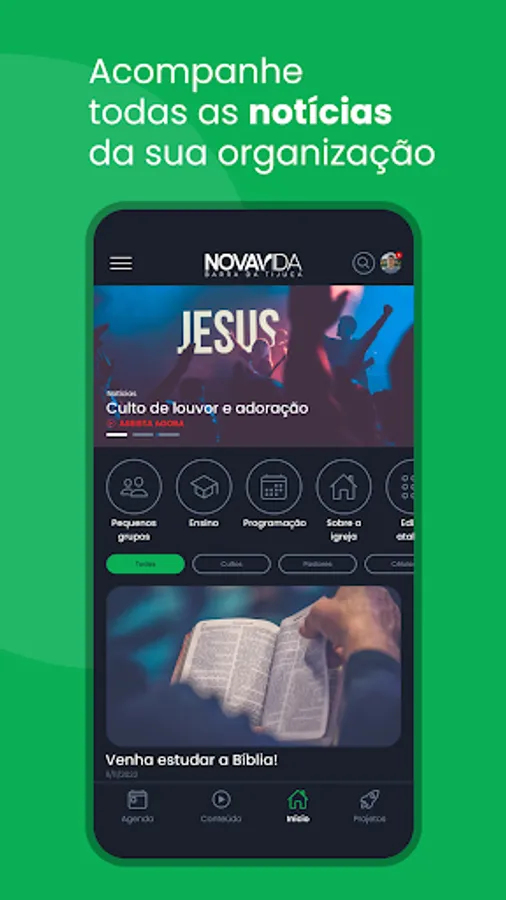 Resources available in the Application: News, Church Calendar, Events, Content, Projects, Live Transmission and Teaching Module.”