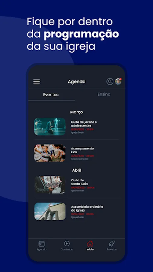 Resources available in the Application: News, Church Agenda, Events, Content, Projects, Live Stream and Teaching Module.