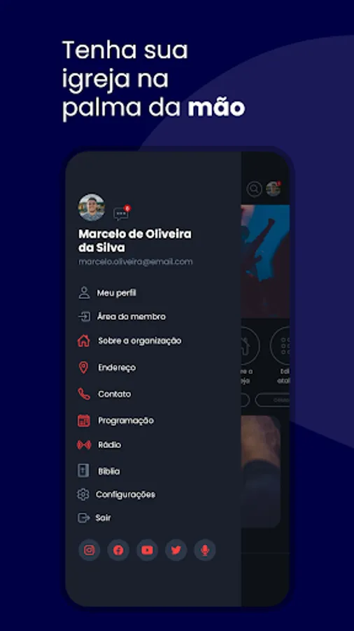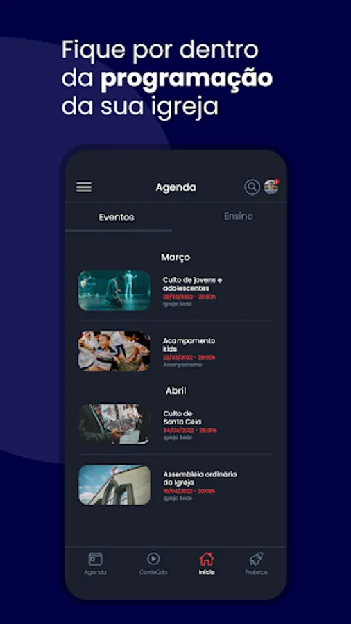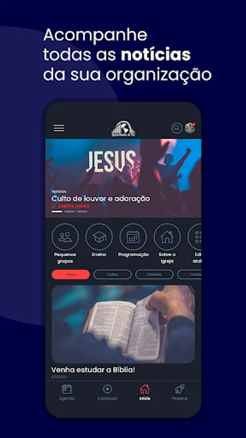Resources available in the Application: News, Church Agenda, Events, Contents, Projects, Live Transmission and Teaching Module.