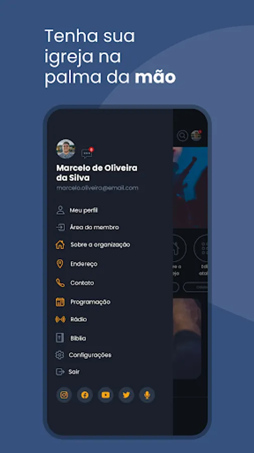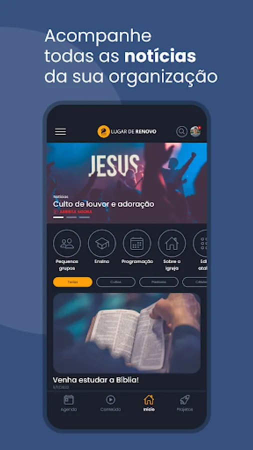 Resources available in the Application: News, Church Agenda, Events, Contents, Projects, Live Transmission and Teaching Module.