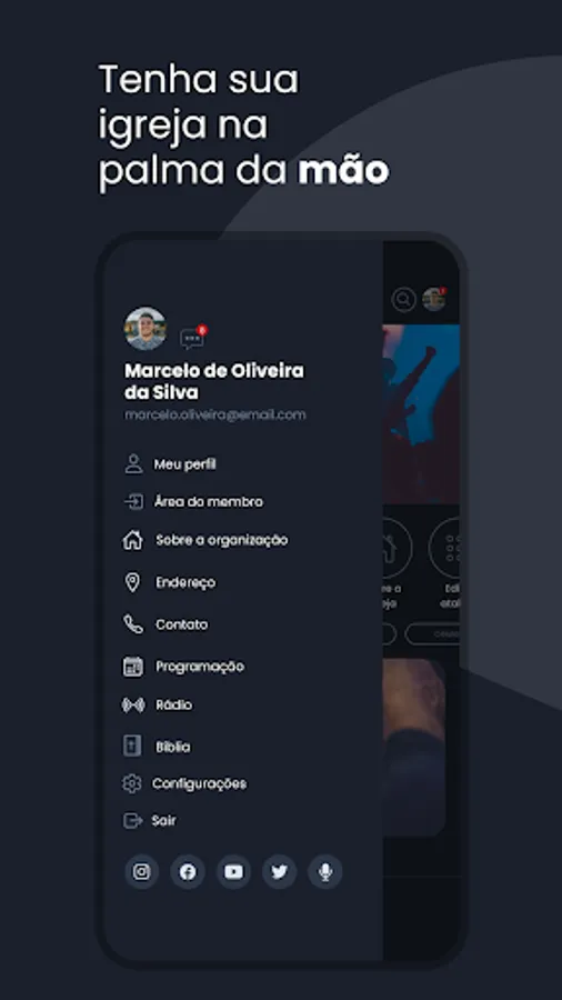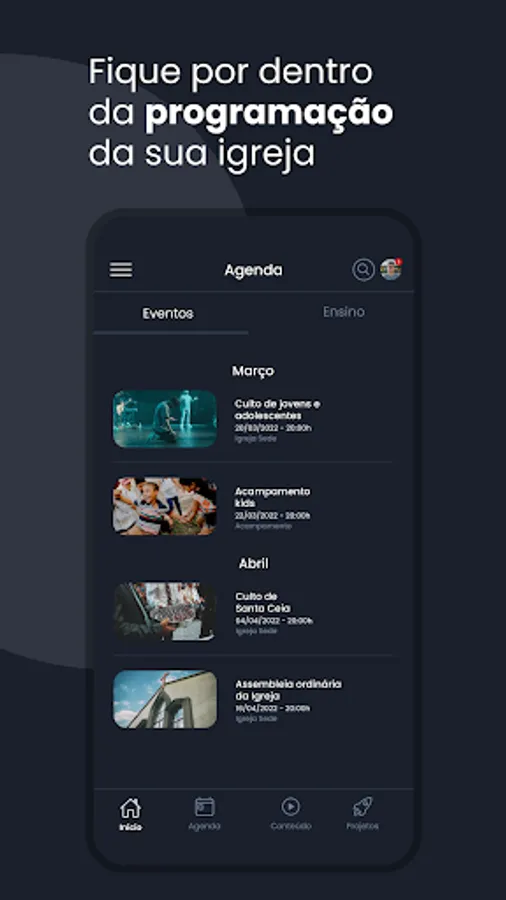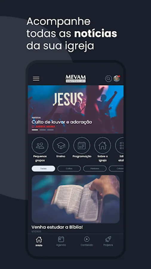 Resources available in the Application: News, Church Agenda, Events, Contents, Projects, Live Transmission and Teaching Module.