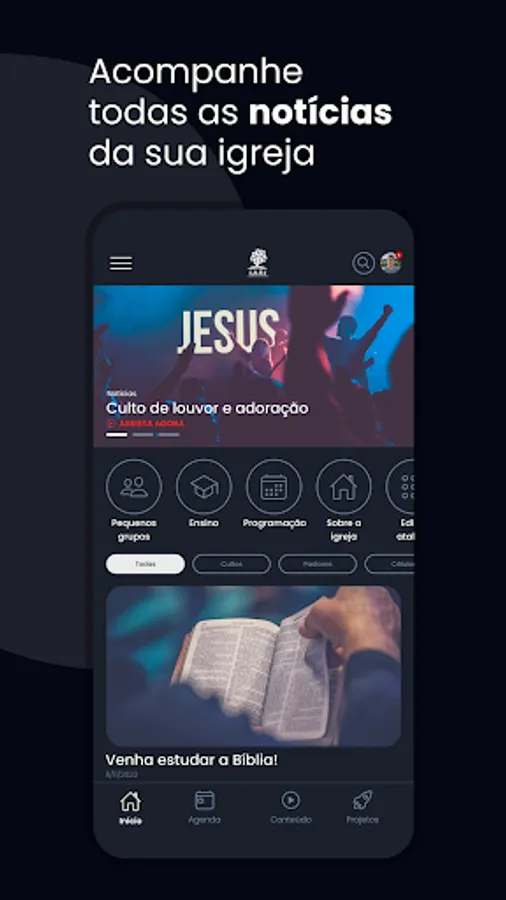 Resources available in the Application: News, Church Agenda, Events, Contents, Projects, Live Transmission and Teaching Module.