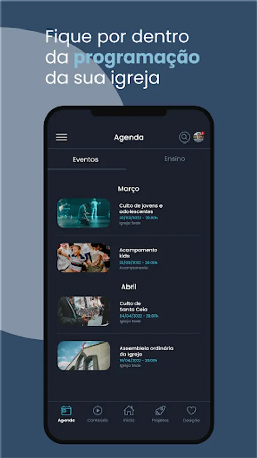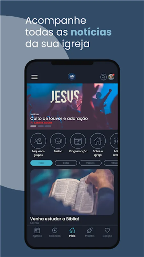 Resources available in the Application: News, Church Agenda, Events, Contents, Projects, Live Transmission and Teaching Module.