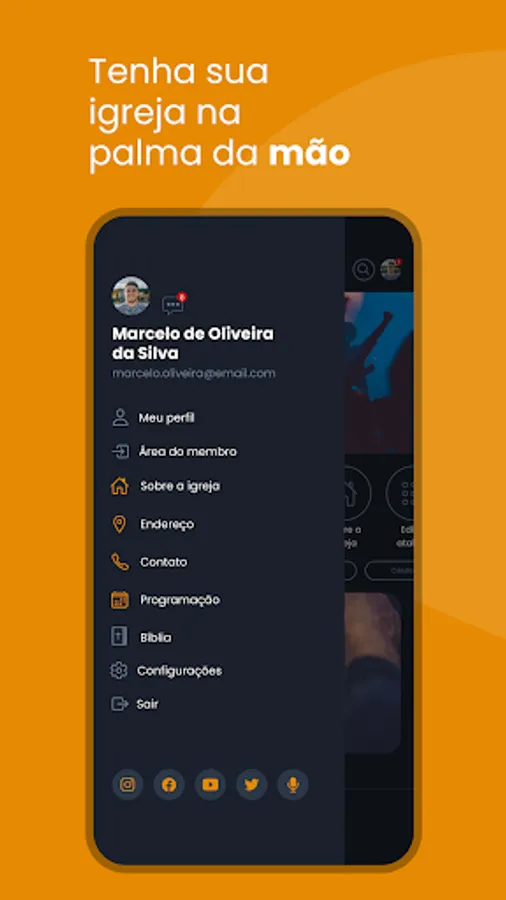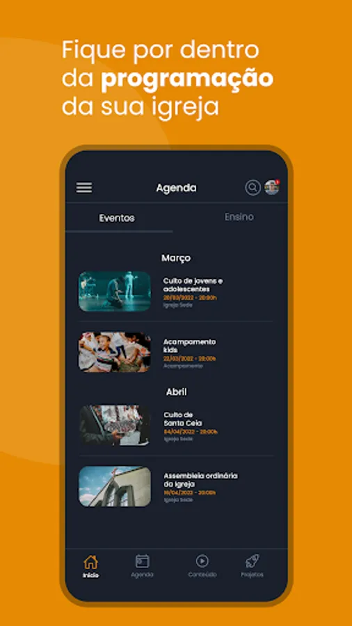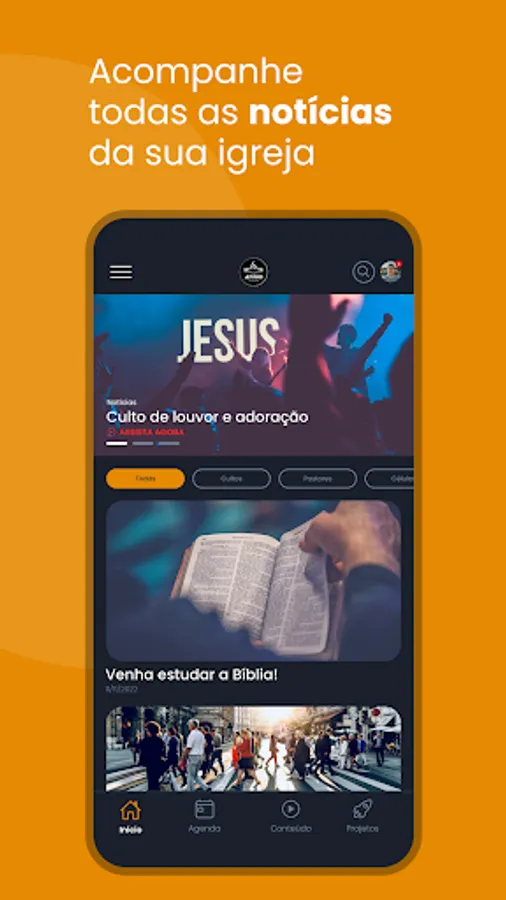 Resources available in the Application: News, Church Agenda, Events, Contents, Projects, Live Transmission and Teaching Module.