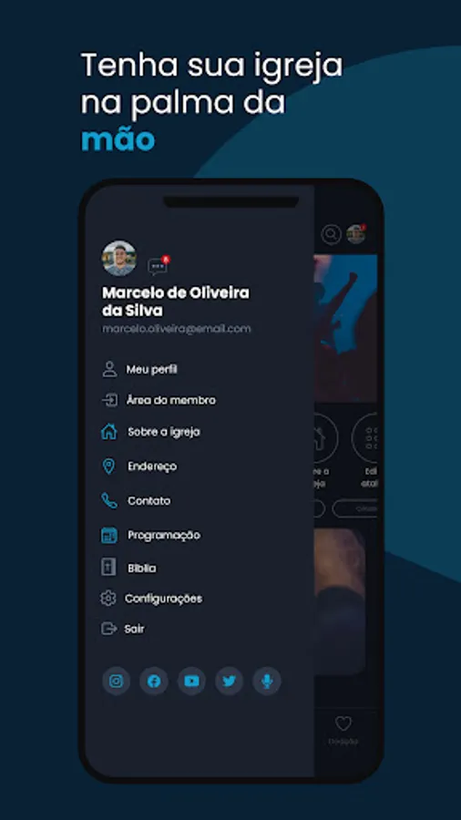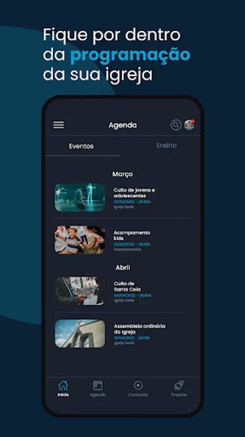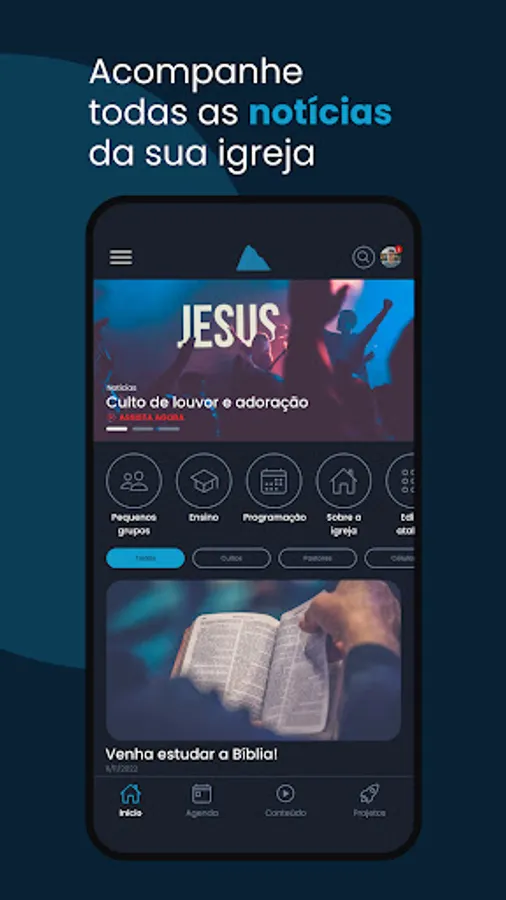 Resources available in the Application: News, Church Agenda, Events, Contents, Projects, Live Transmission and Teaching Module.