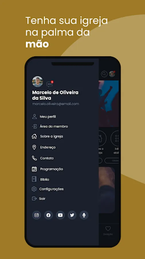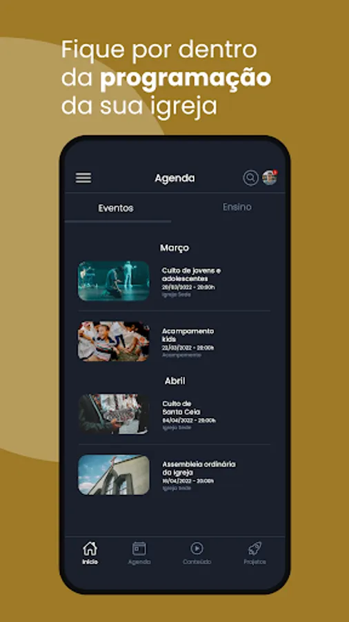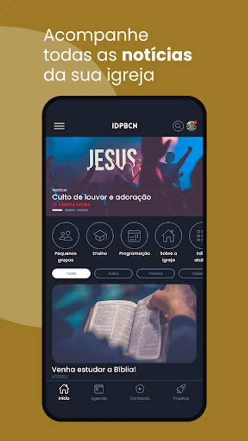 Resources available in the Application: News, Church Calendar, Events, Content, Projects, Live Broadcast and Teaching Module.
