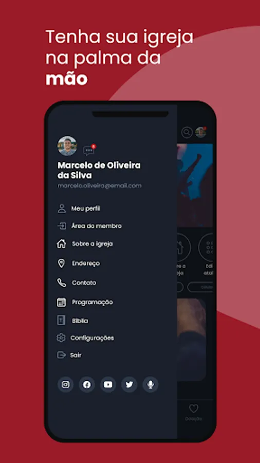 Resources available in the Application: News, Church Calendar, Events, Content, Projects, Live Broadcast and Teaching Module.