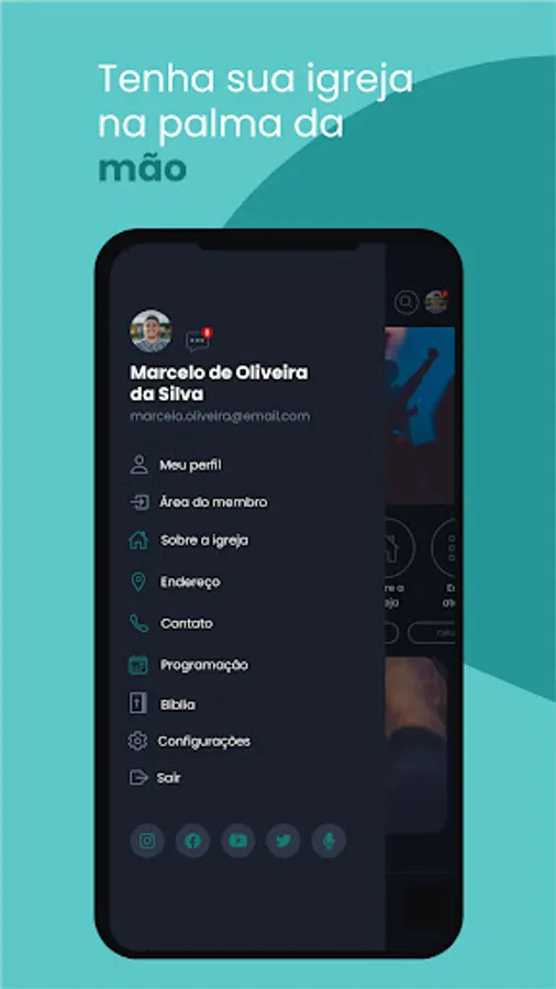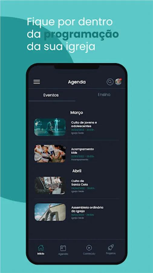 Resources available in the Application: News, Church Agenda, Events, Contents, Projects, Live Transmission and Teaching Module.