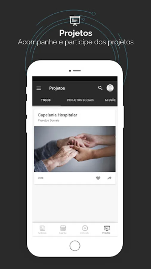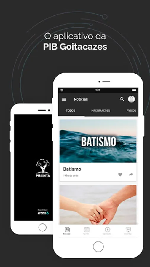 Resources available in the App: News, Church Agenda, Events, Content, Projects, Live Broadcast and Teaching Module.