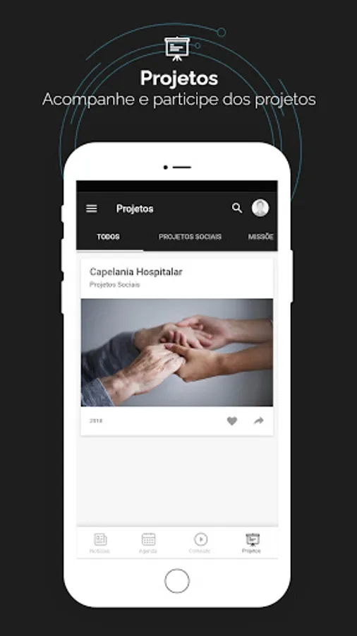 Resources available in the App: News, Church Agenda, Events, Contents, Projects, Live Broadcast and Teaching Module.