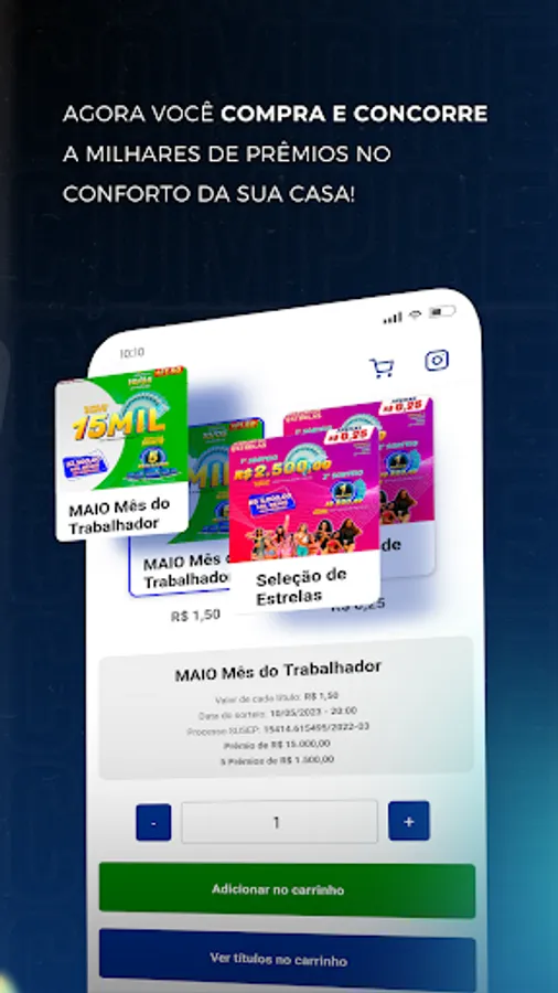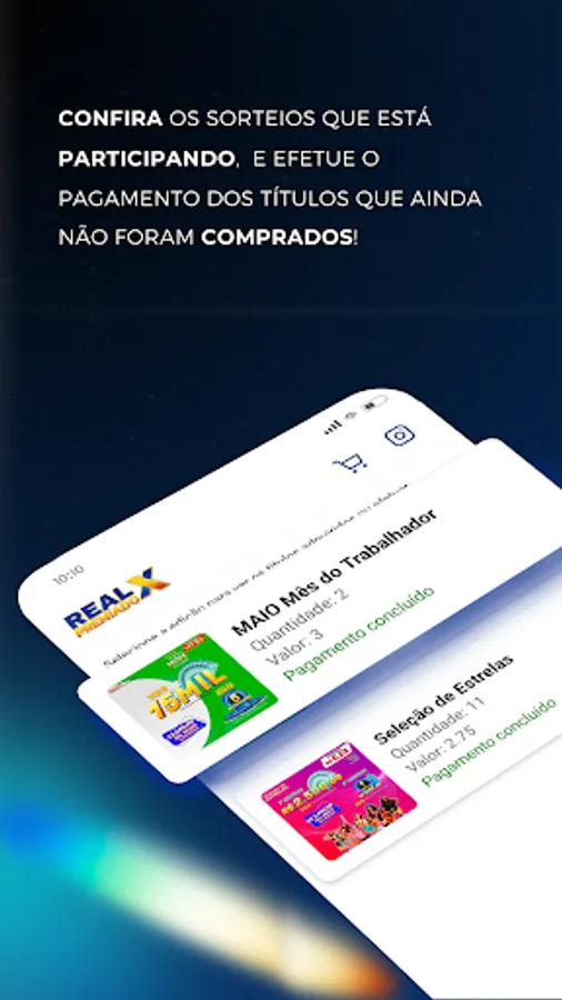 In addition to the realxpremiado.com.br website, you can now purchase and manage your titles through our application. Follow live draws, access results, increase your chances by buying our active editions and share them on your social networks.