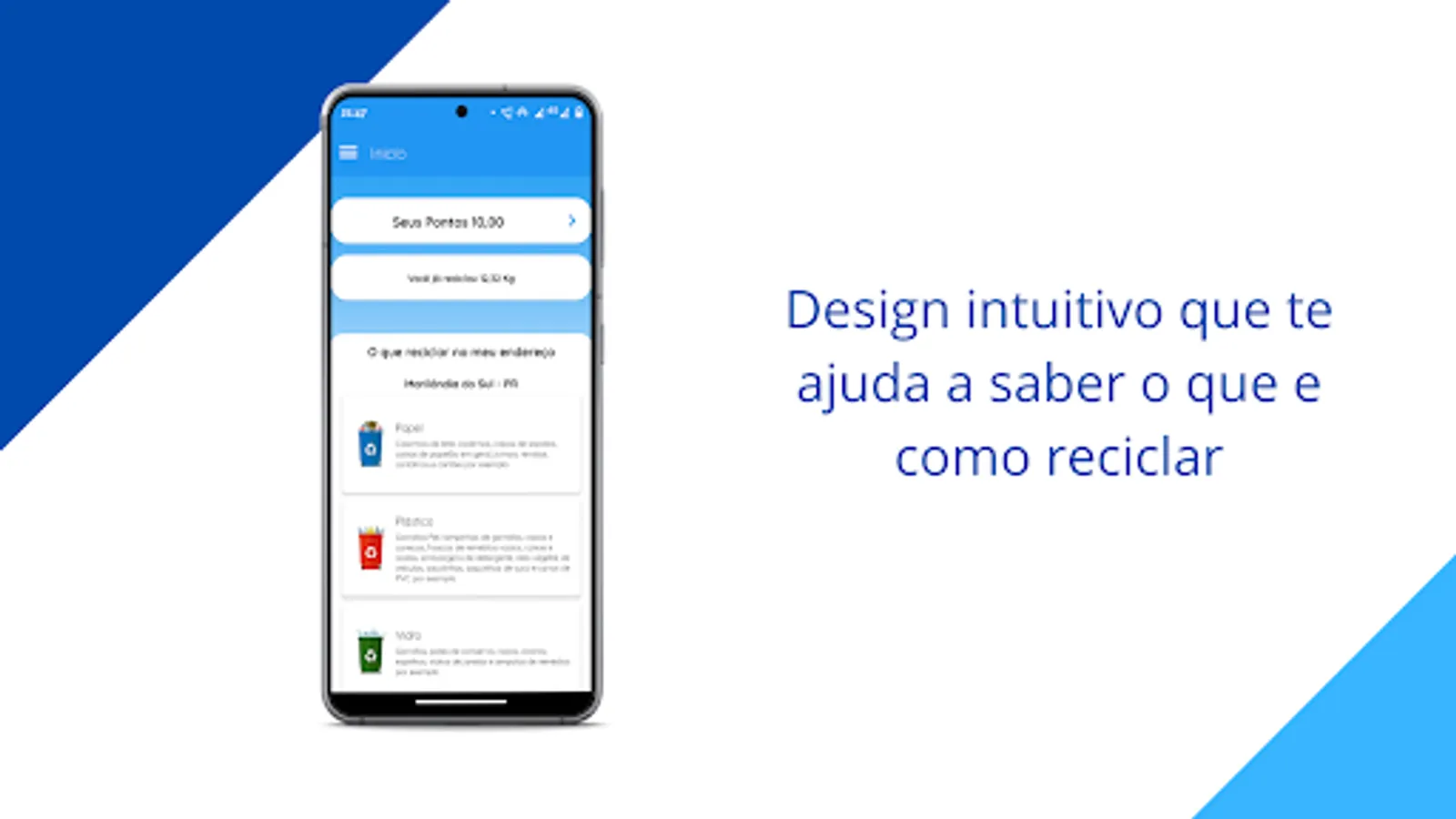 At Recicla There you are our partner! On our platform you can find out what to recycle, how to recycle it and who will recycle it. We connect several collectors and you, who want to recycle. Your recyclable waste will be collected and for that you don't even have to leave the house, as our collector partners will come to you to collect this waste. With our App, you can see how much you've recycled, how many points you've earned and find out where to exchange those points.